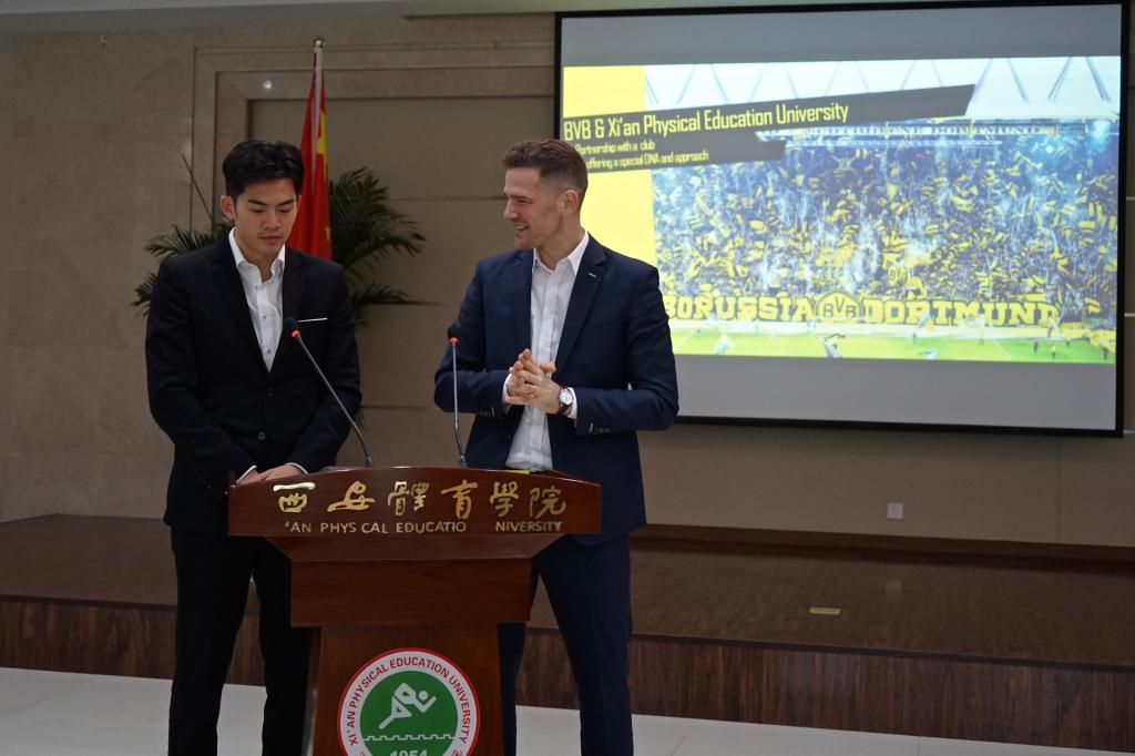 2018年9月14日上午,我院举行了西安体育学院与德国多特蒙德足球俱乐足球战略合作意向书签署仪式。德国多特蒙德俱乐部驻中国办事处大中华区总裁本杰明.瓦尔、德国驻华大使馆(北京)文化处副主任米星辰以及德国商会代表一行9人参加,陕西省体育局副局长邹军、陕西省教育厅体卫艺处副处长李梁、陕西省体育局竞体处副处长路花丽、西安体育学院院长朱元利、副院长陈彦、纪委书记赵军、足球学院院长朱军、西安部分知名中学和足球俱乐部代表出席了签约仪式。签约仪式活动由竞赛训练处处长张鹏华主持。