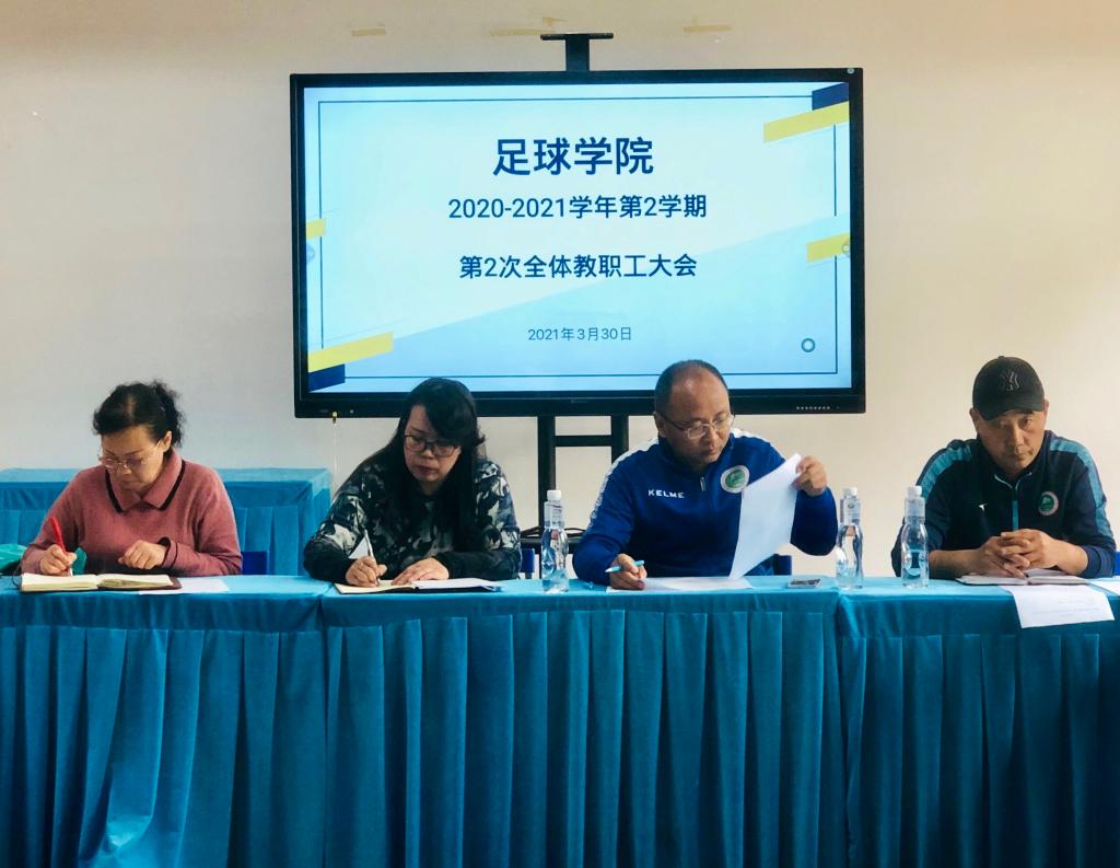 3月30日中午,足球学院召开2020-2021学年第二学期第二次全体教职工大会,院长席海龙主持本次会议。