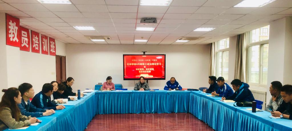 近日,足球学院召开2021年4月教职工政治理论学习暨“知史爱党、知史爱国”党史知识竞答专题交流研讨会。足球学院全体党员干部参加,党总支书记姜梅主持会议。